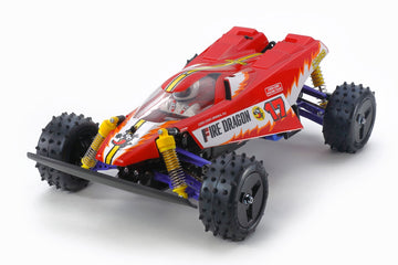 The Fire Dragon was the machine used by the main character of the manga series "Radicon Boy" and was first released as an R/C model back in 1989. Featuring a unique body styling and parts for a driver figure, this colorful buggy is a great way for beginners to get started with this hobby and for veterans of R/C to remind themselves of their childhood years. This updated re-release edition incorporates some updated parts to improve durability.