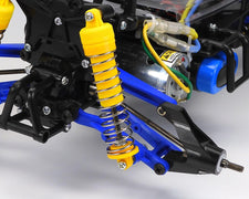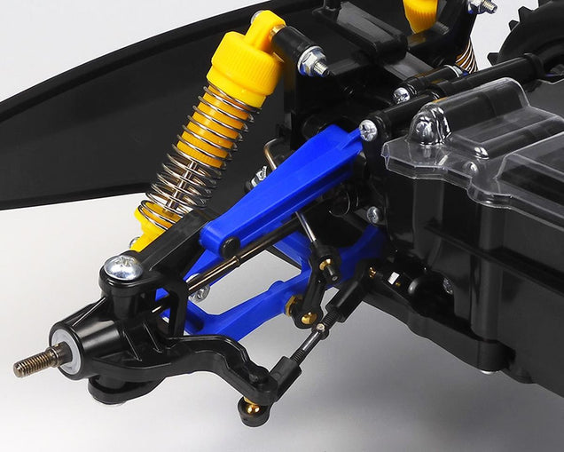 Durable chassis features motor mounted amidships, which powers all four wheels via a shaft drive system. The simple, yet effective, suspension is made up of upper I-arms and lower H-arms for an efficient double wishbone setup. CVA oil dampers at all four corners help absorb shocks from rough terrain while differential gears in the front and rear gearboxes help put the power to the ground smoothly.