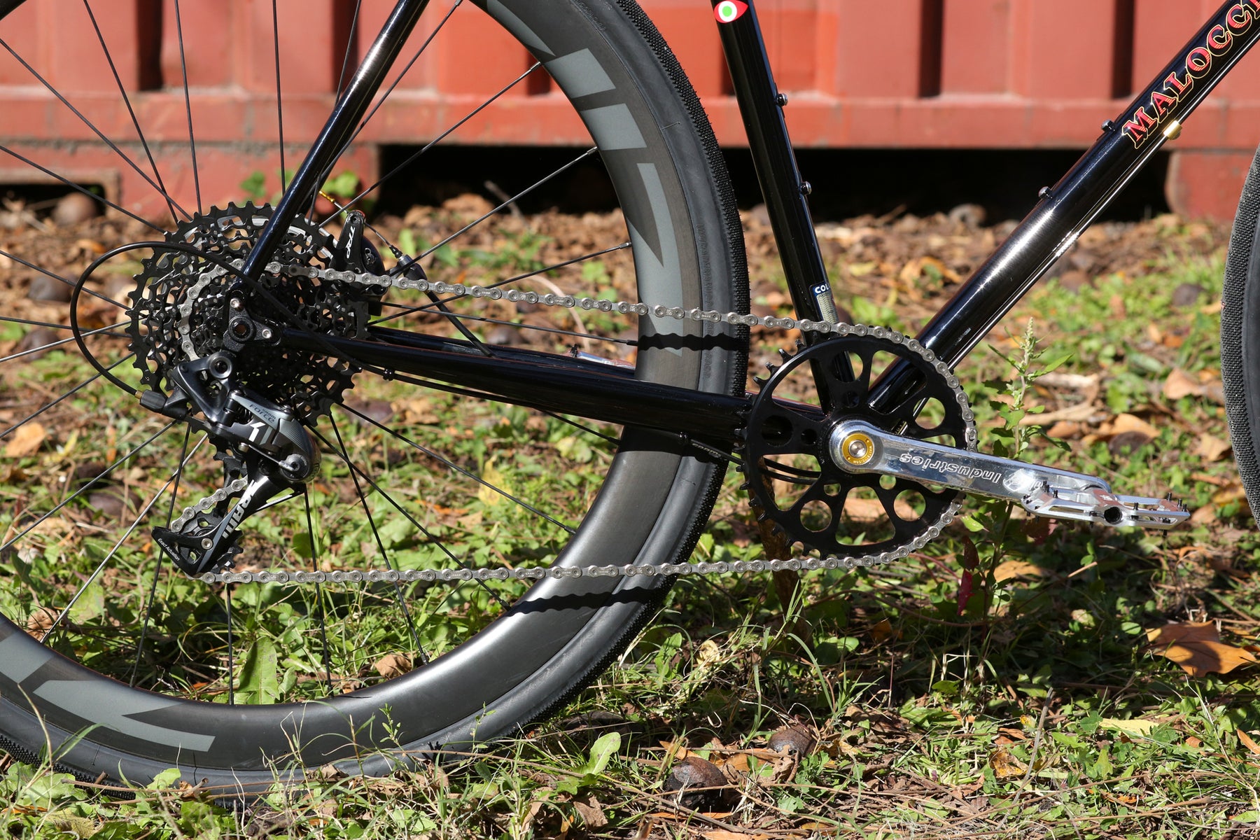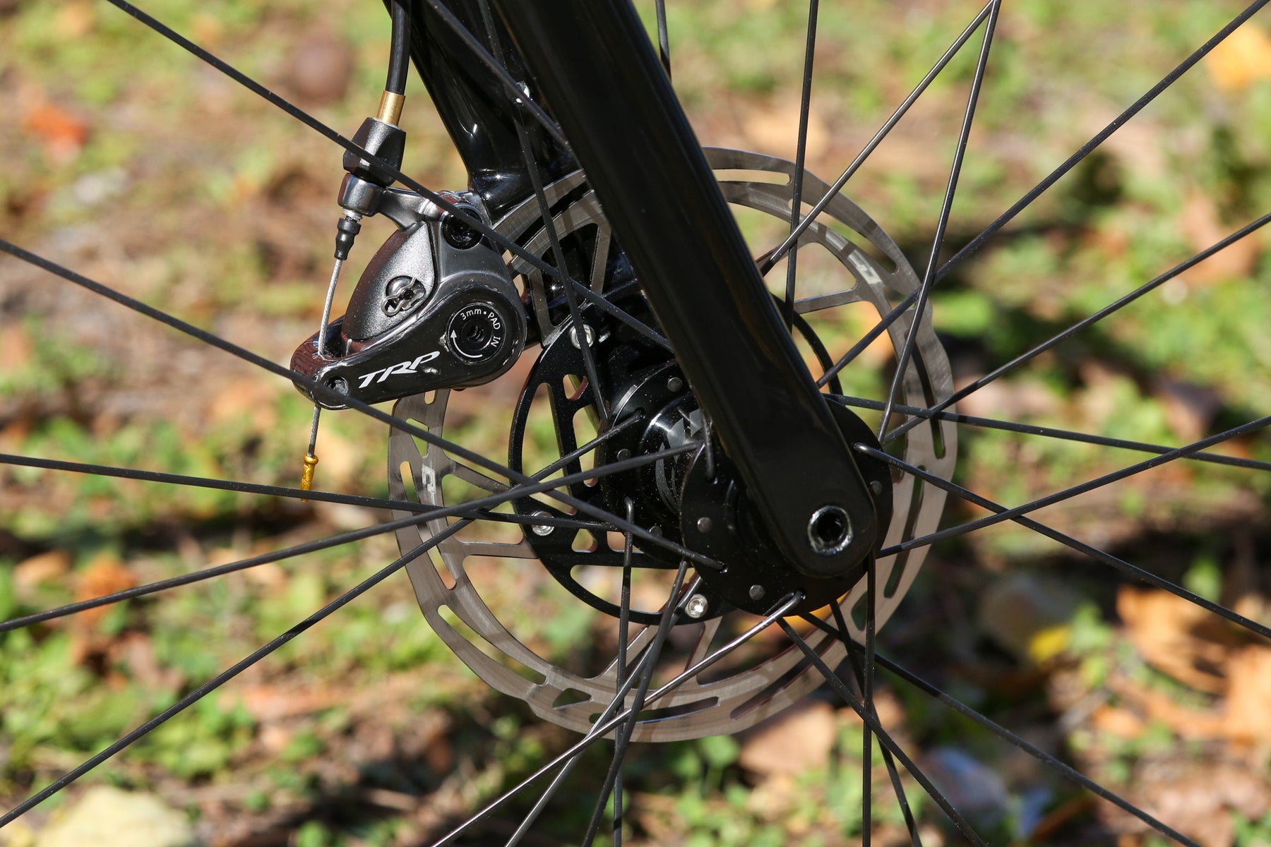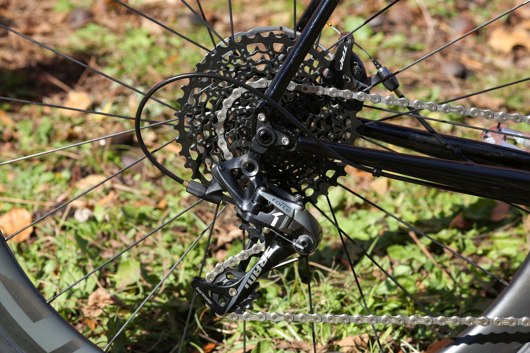 Sram Force 1 Shifter and Derailleur paired up with a GX 10-42t Cassette and 165mm White Industries Square Taper Road Crank with a 40t Chainring. Levers are hooked to TRP Spyre SLC Calipers paired to 160mm Rotors