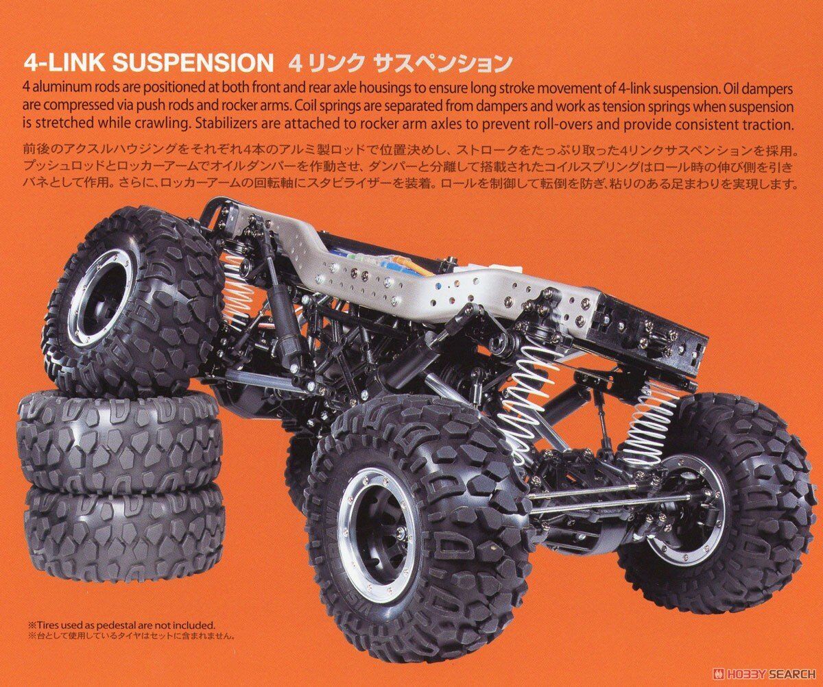 This is a 1/10 scale R/C assembly Rock Crawler machine of the Mercedes-Benz Unimog which has been a long-seller truck among its series since its debut in 1963. The humorous form of its curved hood with round headlights is realistically reproduced by a durable polycarbonate body shell. The Rock Crawling CR-01 chassis features superior off-road performance and is equipped with a durable ladder frame, aluminum side channels and resin cross members, 4-link suspension with aluminum rods and oil dampers, and a shaft driven 4WD with lockable differentials. Also comes with realistic rubber tires with side wall tread patterns and the beadlock wheels. This machine will surely bring you a great enjoyment in conquering difficult rocky terrain.