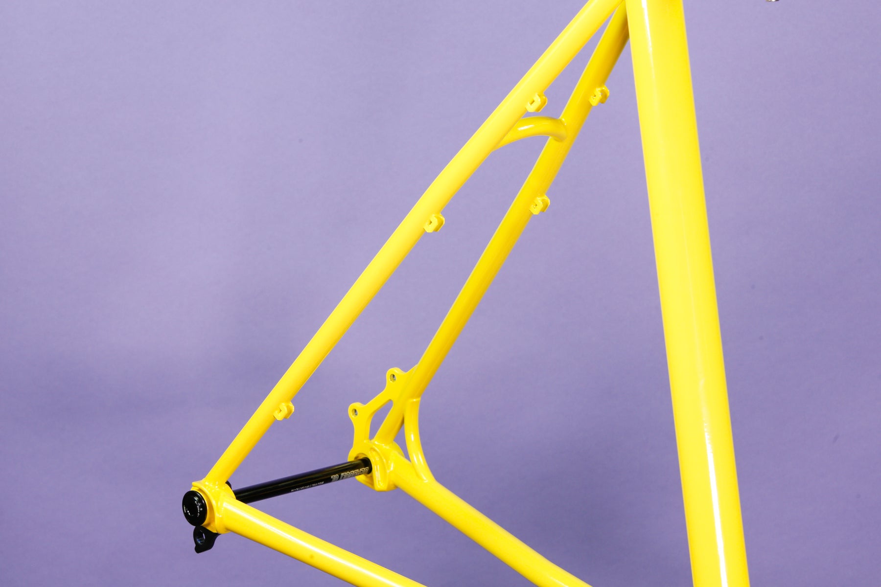 The Dakar is our take on what a "long range" hardtail should be. It's a 26" wheel'd hardtail that's built to be comfortable and fun, not only on the trail, but pedaling to and from and anywhere else one may want to wander off to. Think of it as an Acoustic Rally Bike. It's a hardtail you can really ride far or even tour on. The Dakar utilizes a 26" wheel and the J-Unit 34 Pro fork for a few reasons, but one of the bigger ones is; front triangle size! The smaller wheel and fork combo make it so the front triangle can be larger. A big front triangle means you can run a larger long range gas tank (full frame bag) INSIDE of the triangle instead of a tiny one on top of the top tube (🤢). The other up-side to a 26" wheel is it keeps the bike nice and snappy and maneuverable. It seems like everyone wants to "shred" these days, and the smaller the wheel the harder you can rip, for a multitude of reasons.