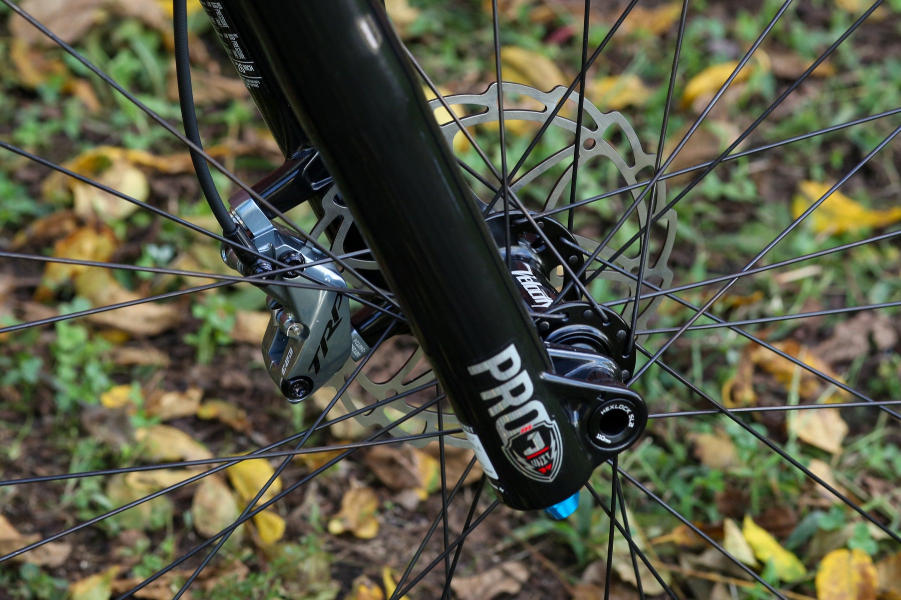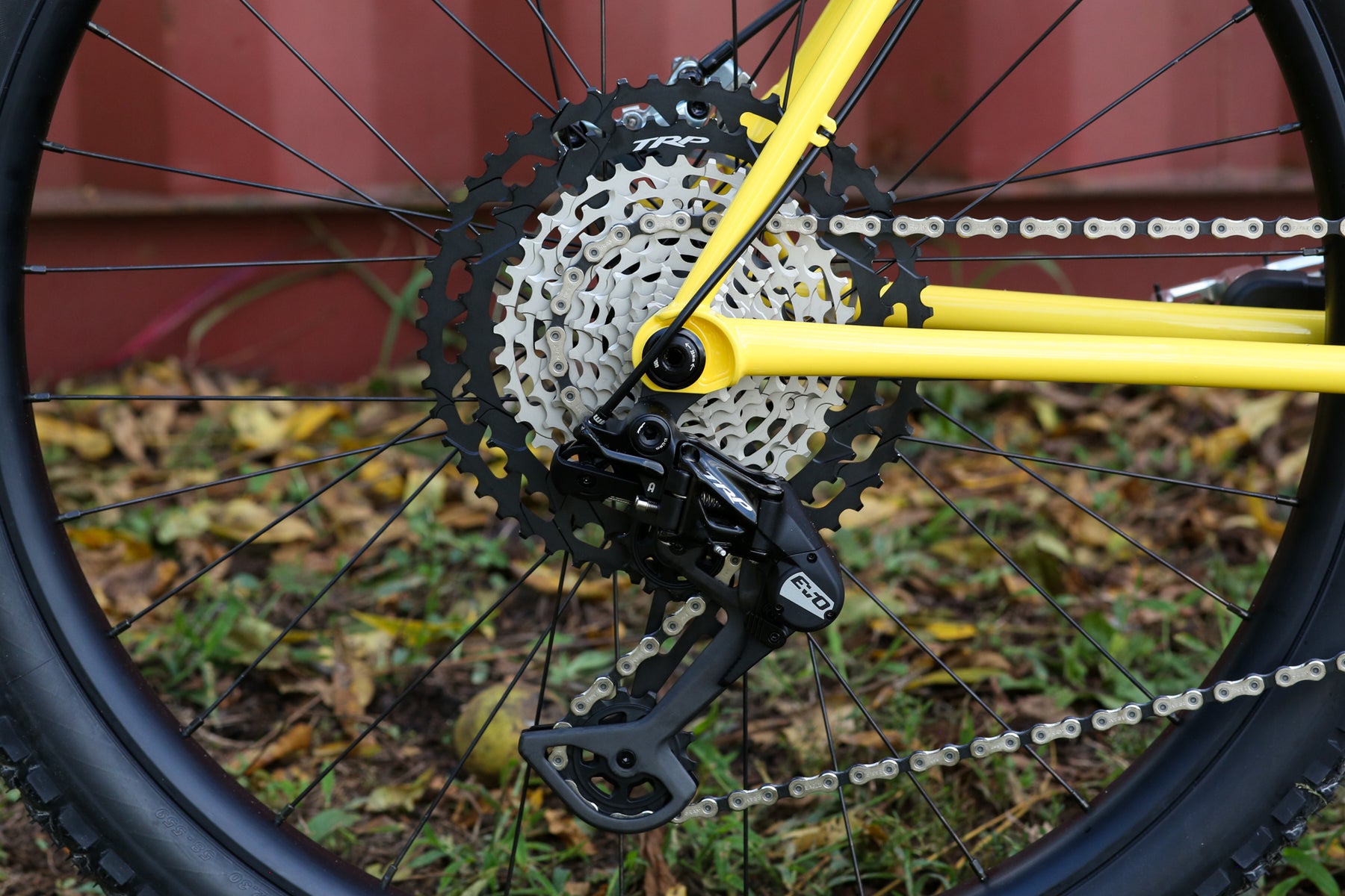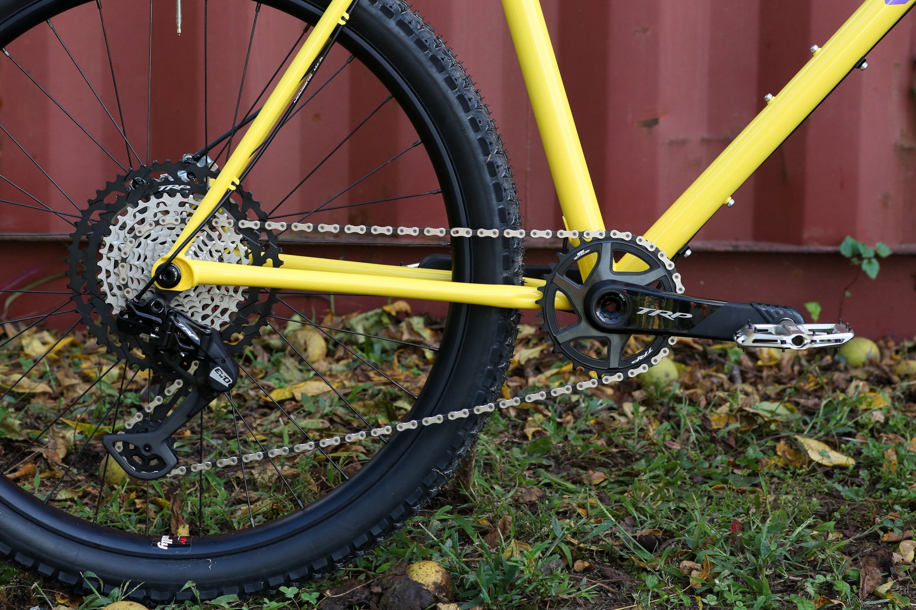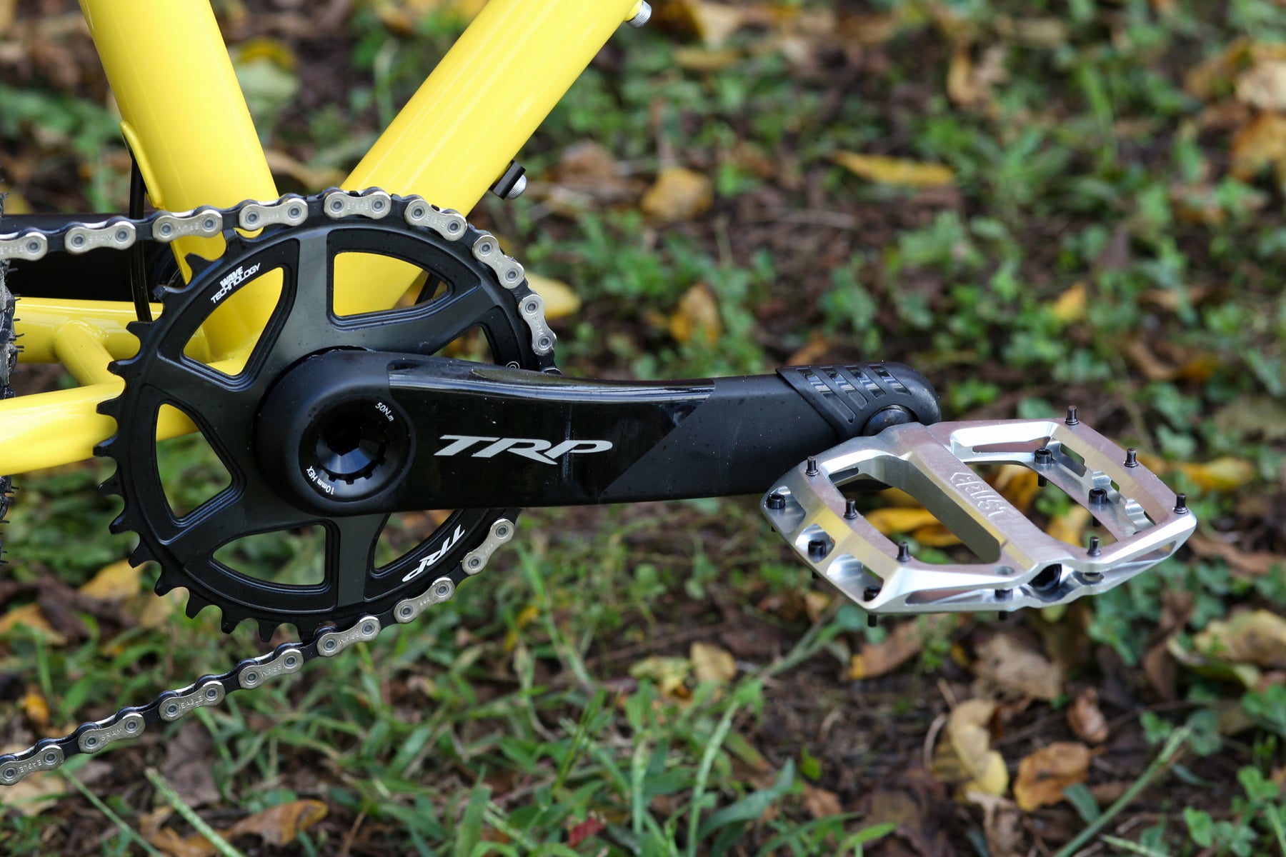 Full TRP EVO Groupset with 165mm Crankset a 34t Chainring and a 10-52t Cassette being pushed around by a set of Northbank Pedals